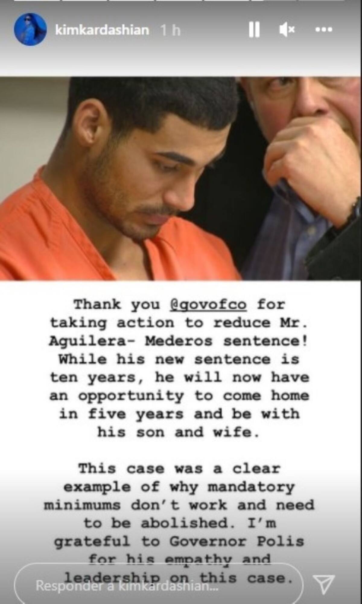 Kim Kardashian, a través de Instagram, escribió un mensaje agradeciendo la disposición de la autoridad: "Gracias Gobernador por tomar medidas para reducir la sentencia del Sr. Aguilera-Mederos. Si bien su nueva sentencia es de diez años, ahora tendrá la oportunidad de volver a casa en cinco años y estar con su hijo y su esposa. Este caso fue un claro ejemplo de por qué los mínimos obligatorios no funcionan y deben ser abolidos. Agradezco al gobernador Polis por su empatía y liderazgo en este caso".