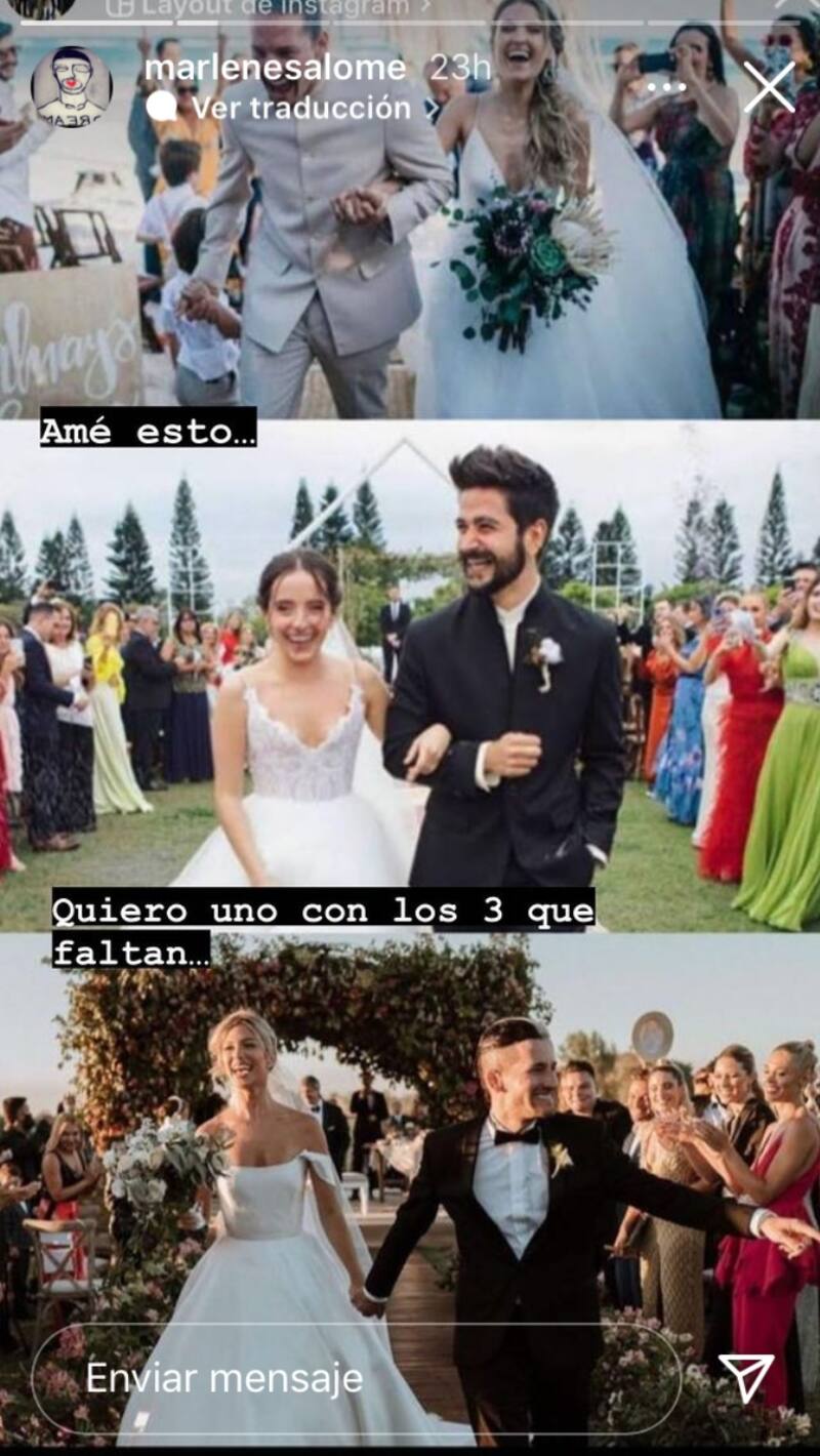 Marlene también subió un video con uno de sus momentos favoritos. “Uno de mis highligts de la boda fue ver a estos panas compartiendo, todos inmensos en lo que hacen pero lo que prevalece es la amistad, cero ego”, escribió. En la grabación se encuentran Mau y Ricky junto a Camilo, Sebastián Yatra y Manuel Turizo cantando.