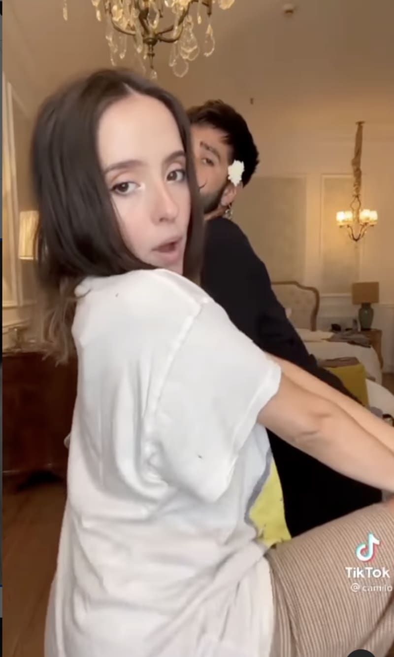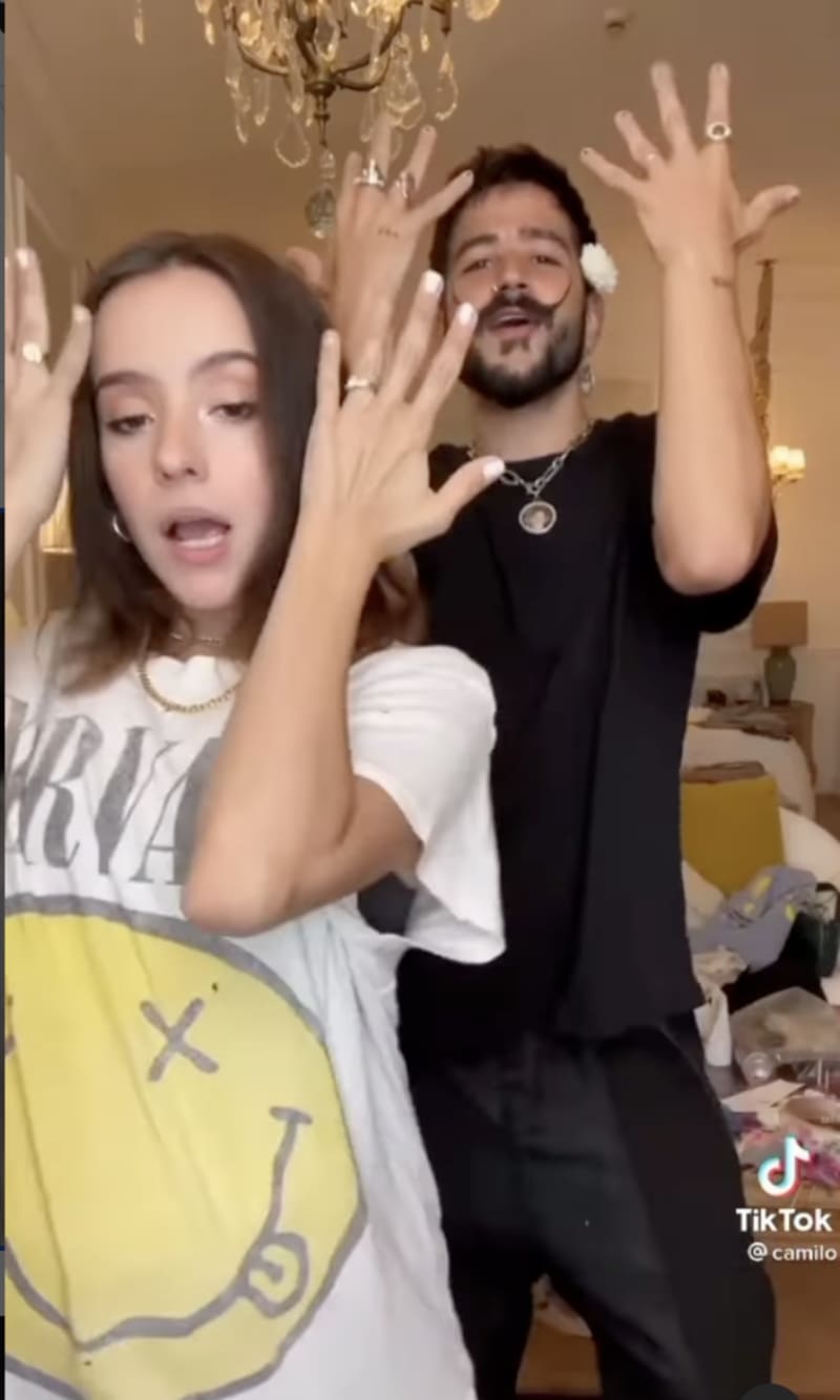 En el video se ve a Evaluna con una playera holgada de Nirvana con la que se disimulaba muy bien su pancita, mientras Camilo, que estaba atrás de ella estaba vestido totalmente de negro con una flor en la cabeza, mientras los dos hacían el baile completamente coordinados.