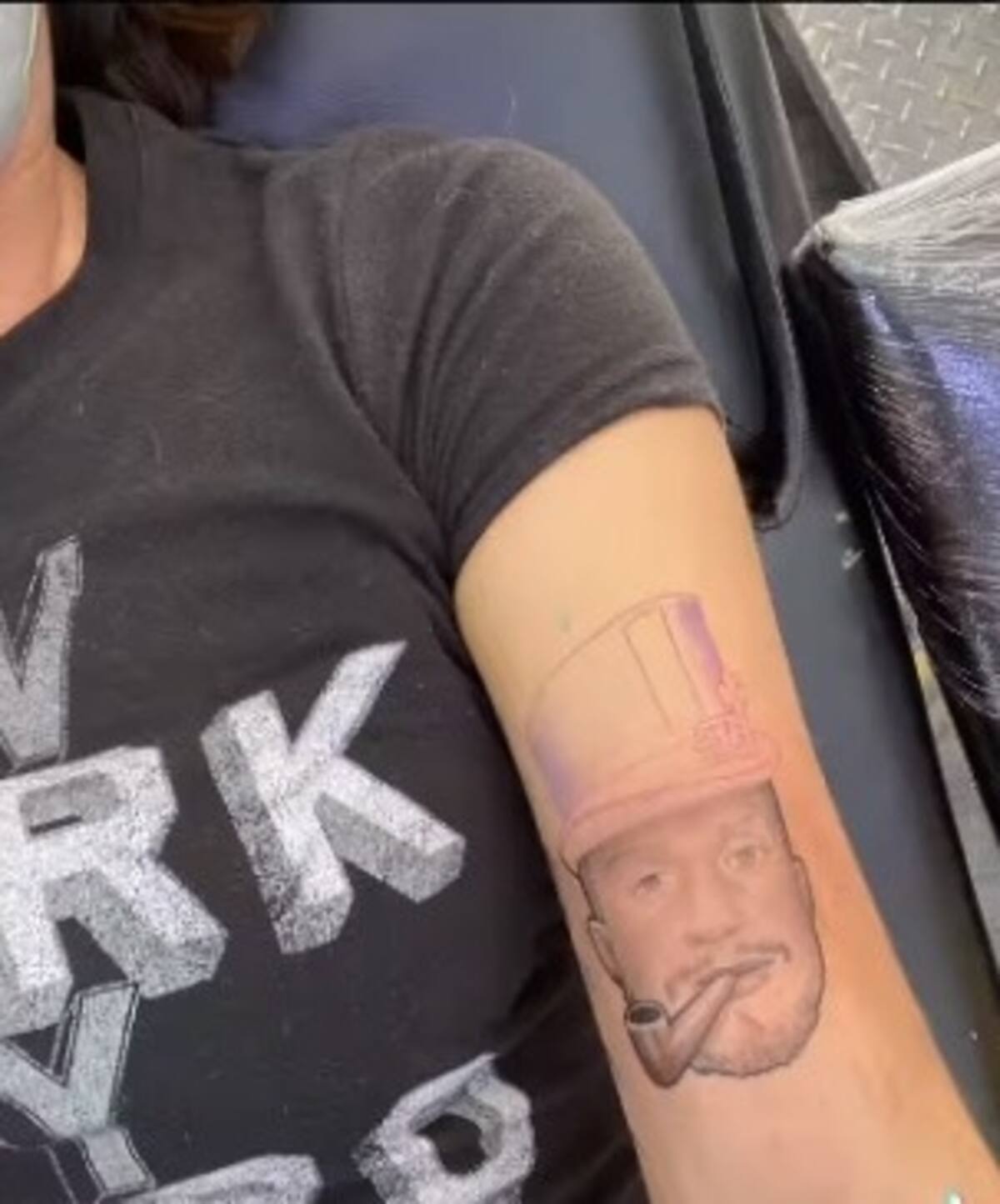 "Te amo. Maravilloso arte por @emserone", escribió Godínez. El tatuaje es muy parecido al que Ocaña llevaba en el brazo, en el cual tenía impreso a un hombre con sombrero verde, esto lo retrataron en la misma parte del cuerpo de Godínez con un ligero cambio, pues agregaron la cara del actor de Vecinos.