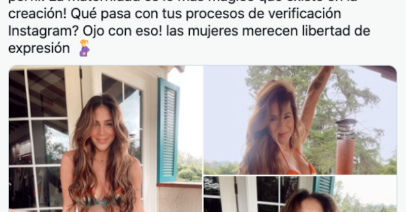 Todo comenzó cuando la intérprete publicó en su cuenta unas fotos en bikini luciendo su embarazo en todo esplendor mientras posaba en una hamaca, sin embargo, después de unos minutos, las imágenes ya no aparecieron en su perfil, pese a que ya tenía un gran número de likes y comentarios.