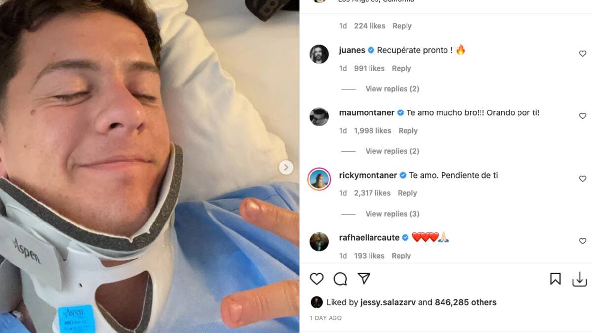 "Agradecido con la vida, y con papito Dios. En la madrugada de ayer, fui víctima de un accidente vehicular. Ahora toca recuperarse. Sé que con el apoyo de mi familia, amigos, y fanaticada, voy a salir lo más pronto posible de esto. Gracias a todos por sus mensajes, y por sus llamadas. ¡Los amo! Guaynaa", fueron las palabras con las que el novio de Lele Pons acompañó esta publicación.