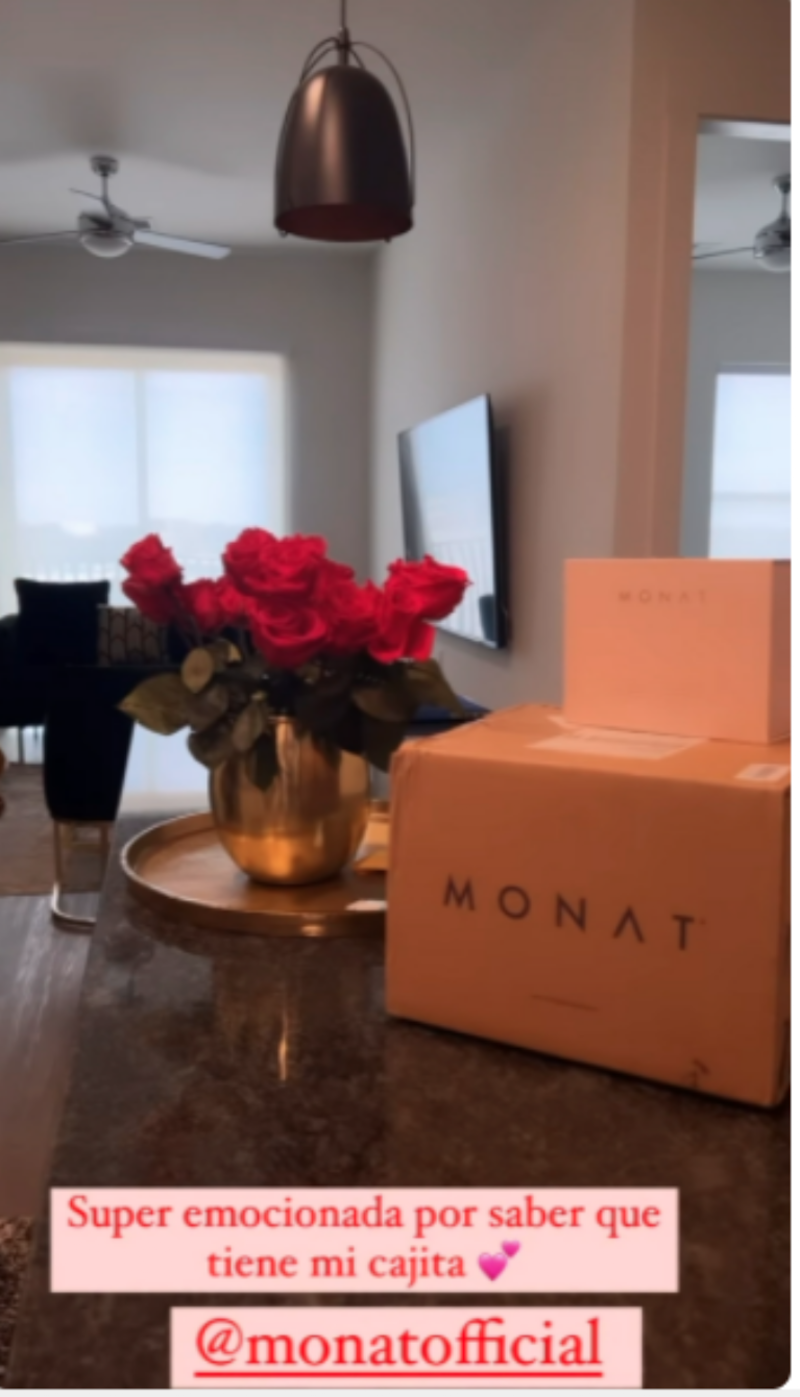 Beltrán subió a sus redes sociales que recibió una caja de la firma Monat, empresa con la que Toni Costa colabora, por lo que las especulaciones de que él se lo mandó, comenzaron: "Súper emocionada por saber que tiene mi cajita".