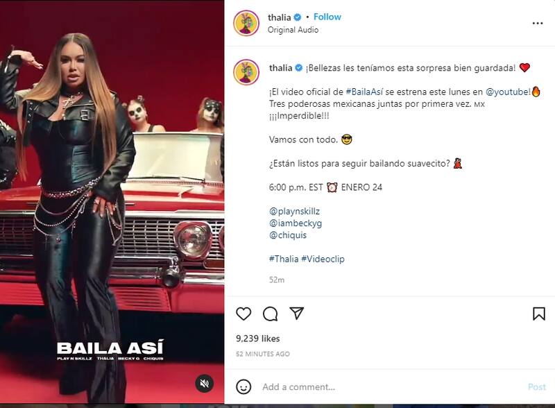 "¡Bellezas les teníamos esta sorpresa bien guardada! ¡El video oficial de #BailaAsí se estrena este lunes en @youtube! Tres poderosas mexicanas juntas por primera vez. ¡¡¡Imperdible!!! Vamos con todo. ¿Están listos para seguir bailando suavecito? 6:00 p.m. EST. ENERO 24" escribió Thalía en su perfil de esta red social.