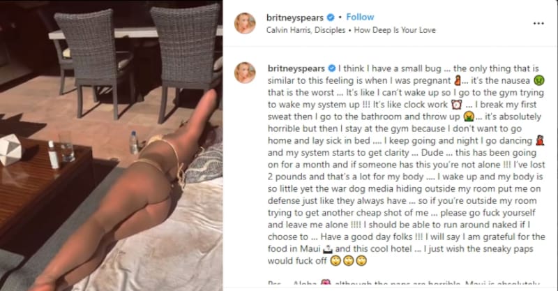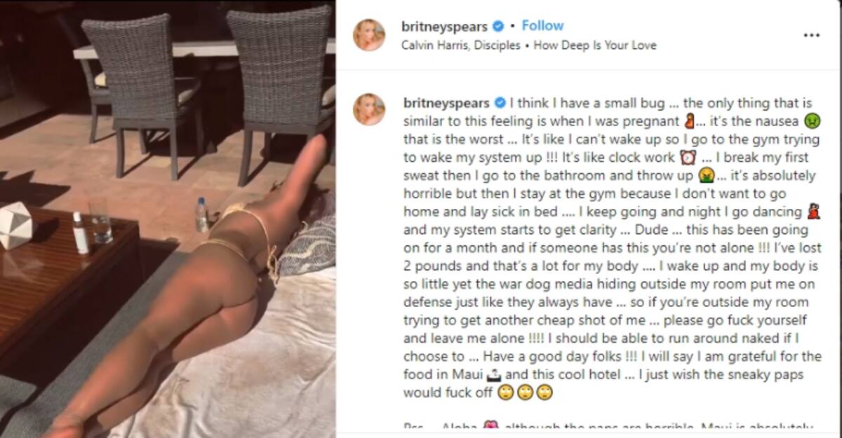 A través de redes sociales la Britney Spears presumió algunas fotos de sus vacaciones en Maui, Hawái, al mismo tiempo que habló de un posible virus que le provoca vómitos durante el día. Apenas subió esta declaración a su cuenta de Instagram, los mensajes de sus seguidores comenzaron a llenarla con comentarios y deseos de pronta recuperación.