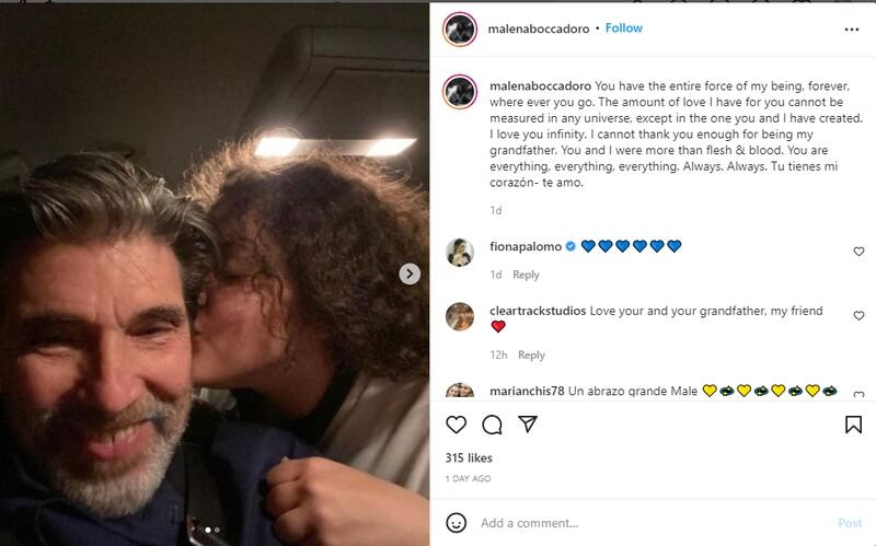 Es por ello que recientemente fue su nieta Malena Boccadoro quien, a través de redes sociales, compartió un par de fotos donde se le ve dar un tierno beso a su abuelo, además de dedicarle emotivas palabras y reiterar su amor por el intérprete de Volveré.