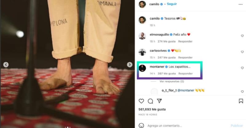Esta vez Montaner le llamó la atención a Camilo, el esposo de su hija Evaluna, quien compartió una serie de fotografías bajo el título de “Tesoros”, en una ella sólo se observan sus pies descalzos sobre el escenario. A lo que su suegro escribió “Los zapatitos…”, lo que de inmediato provocó comentarios y risas en el perfil del cantante colombiano.
