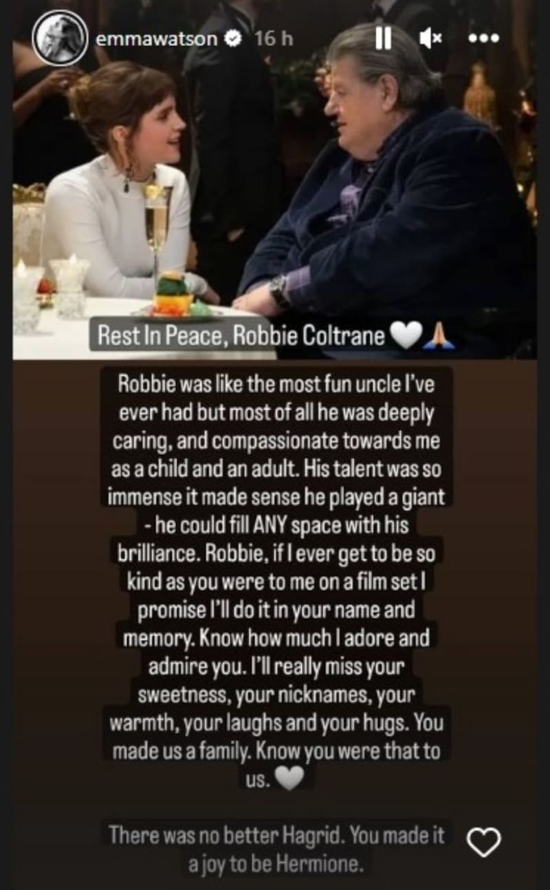 Watson concluyó su emotivo texto agradeciéndole su presencia en esta vida: "Nos convertiste en una familia. Sé que fuiste eso para nosotros. No había mejor Hagrid. Hiciste que fuera un placer ser Hermione".