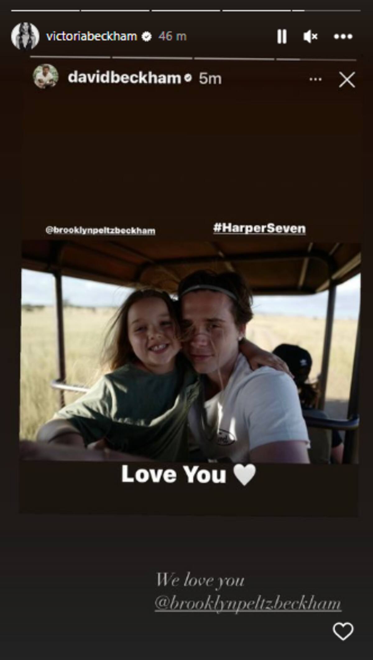 "Los amo a todos", escribió David sobre una fotografía donde aparece la famosa diseñadora de moda caminando atrás de sus cuatro hijos de forma lineal. Mientras que, en una segunda imagen, reposteada por Victoria en su Instagram, aparece la pequeña Harper (7) compartiendo un conmovedor abrazo con su hermano mayor, Brooklyn; la ex Spice Girls escribió un mensaje muy específico: "Te amamos @brooklynpeltzbeckham".