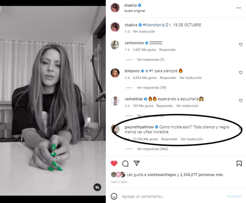 El tema titulado Monotonía, que según los fans está dedicado a su ex pareja Gerard Piqué (35), estará disponible este miércoles 19 de octubre en todas las plataformas digitales y la colombiana compartió un corto video en blanco y negro en el que aparece triste cantando un extracto de la canción, el único color que llama la atención son sus uñas, largas y de color verde, y es precisamente este detalle fue el que robó la atención de Gwyneth Paltrow (50).