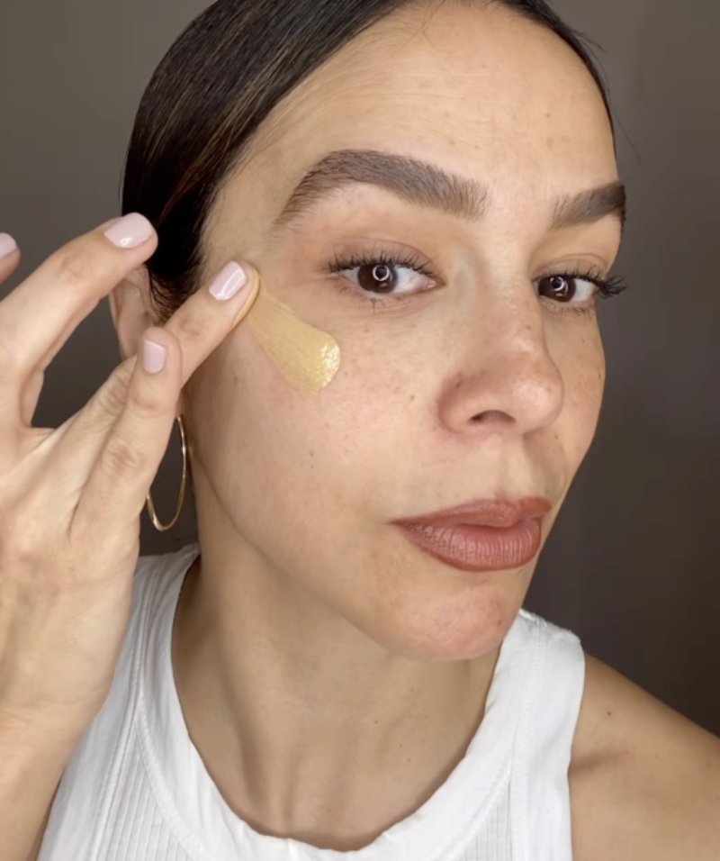 Biby Gaytán vestida con una camiseta blanca, aretes de aro dorados y una cola de caballo enseñó cómo se aplica la base en el rostro y sus fans se percataron que tiene pecas, pese a que siempre las ha mantenido ocultas: "Para un acabado natural, uso la misma base en diferentes tonos para darle dimensión a mi rostro".