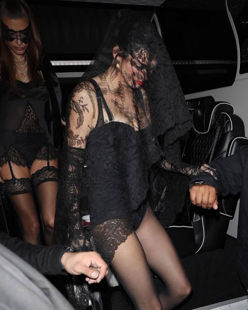 Los outfits más comentados fueron los de Justin Bieber (28), su esposa Hailey Bieber (25) y su amiga Kendall Jenner (26), quienes lucieron trajes a juego negros, mientras la hermana de Kim Kardashian optó por un velo, la modelo usó sexys medias con encaje, mientras que Justin usó un antifaz muy al estilo de El fantasma de la ópera.
