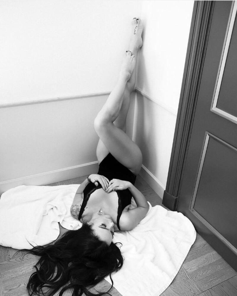 Para la segunda foto optó por recostarse en el piso mientras tiene las piernas recargadas en la pared de una forma muy sensual, de esta manera dejó ver a detalle su look, e incluso se puede observar que lleva puesto un collar que dice “Kate” en letras mayúsculas.