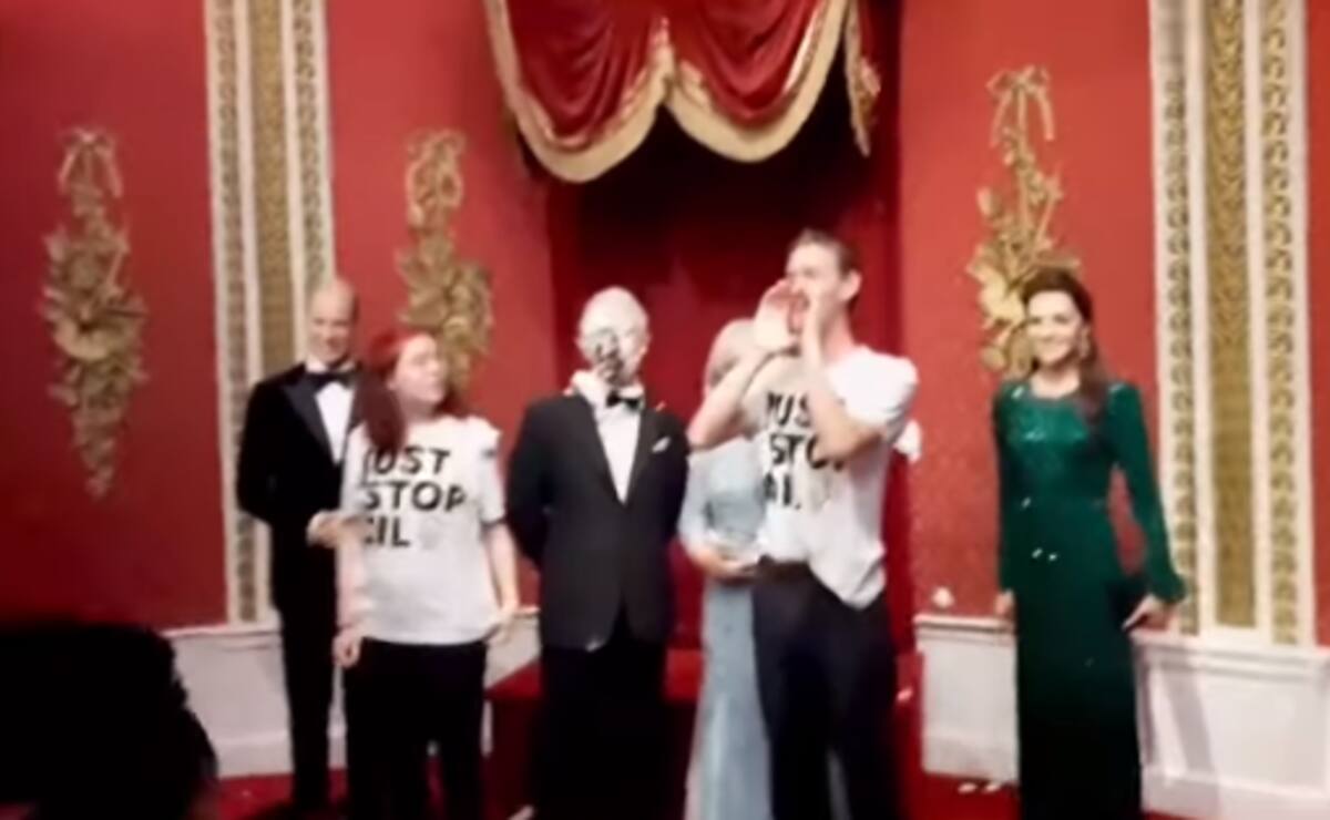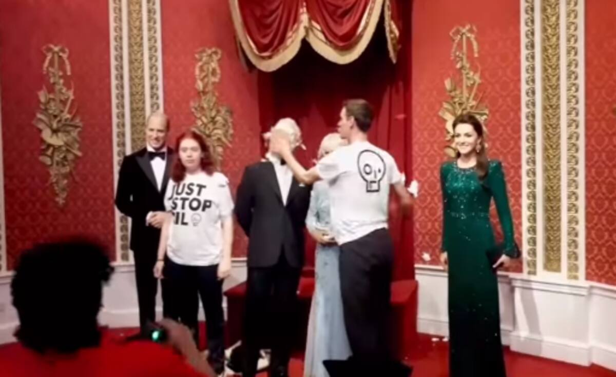 Como un gesto de protesta, este lunes 24 de octubre, dos defensores ambientales se dirigieron hasta el museo londinense de Madame Tussauds para manchar el rostro de la figura de cera de Carlos III con dos tortas, además gritaron una consigna en contra del gobierno británico.