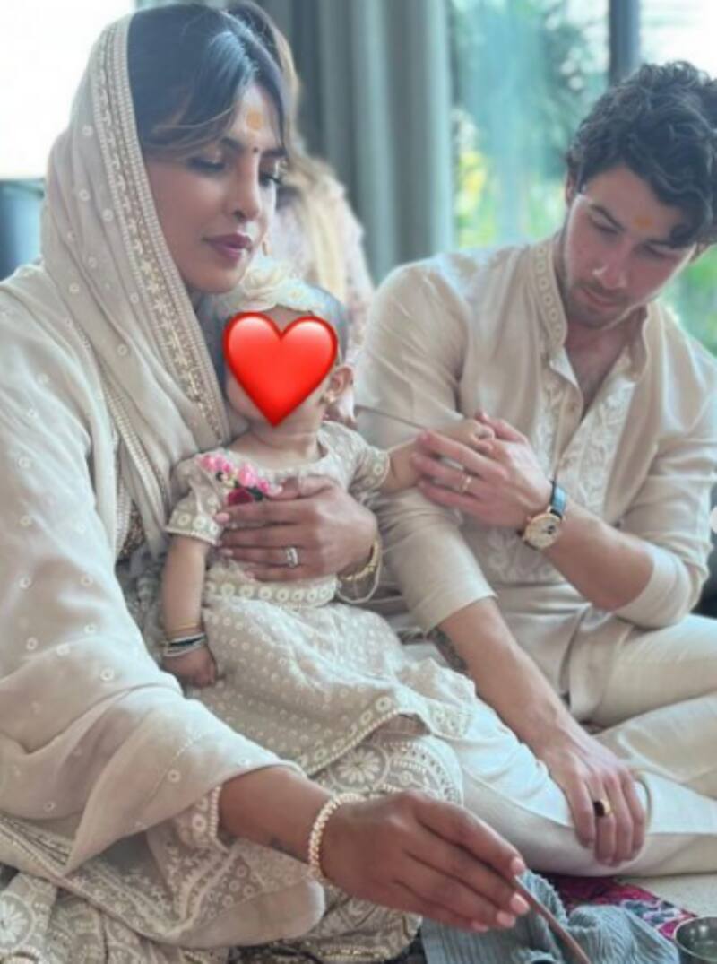 En la segunda foto se ve a Chopra sentada con Malti en su regazo mientras su hija envuelve su mano alrededor del dedo índice de su famoso padre. Ambas imágenes cuentan con un emoji de corazón rojo para ocultar el adorable rostro de Malti.