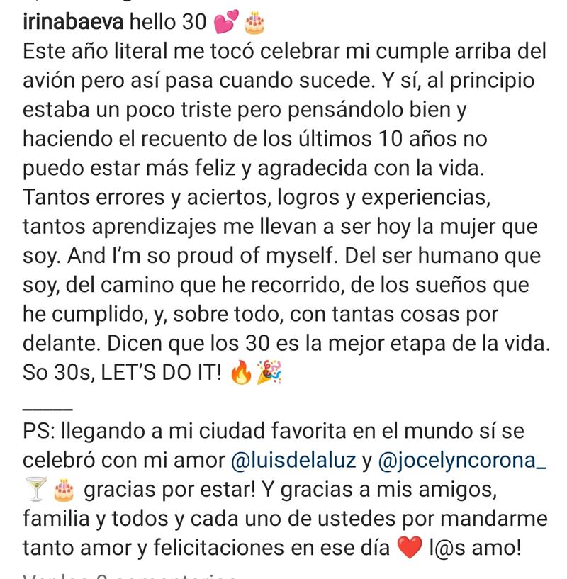 Irina publicó un mensaje en su cuenta de Instagram en el que cuenta cómo pasó el día de su cumpleaños, al final agradeció a todas las personas que han formado parte de su vida y que no se olvidaron de ella en este importante día, como familiares, amigos, conocidos, pero no mencionó al actor.