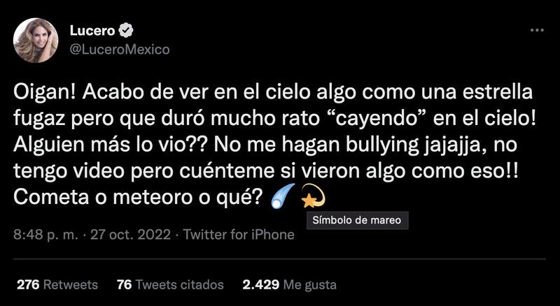 "Acabo de ver en el cielo algo como una estrella fugaz pero que duro mucho rato "cayendo" en el cielo. ¿Alguien más lo vio? No me hagan bullying. No tengo video pero cuéntenme si vieron algo como eso. ¿Cometa o meteoro o qué?", escribió "La novia de América".