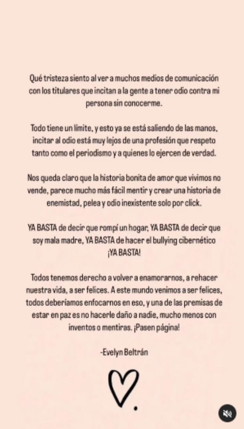 Todos tenemos derecho a volver a enamorarnos, a rehacer nuestras vidas, a ser felices. A este mundo venimos a ser felices, todos deberíamos de enfocarnos en eso y una de las premisas de estar en paz es no hacerle daño a nadie, muchos menos con inventos o mentiras. ¡Pasen la página!”, finalizó el mensaje de Evelyn.