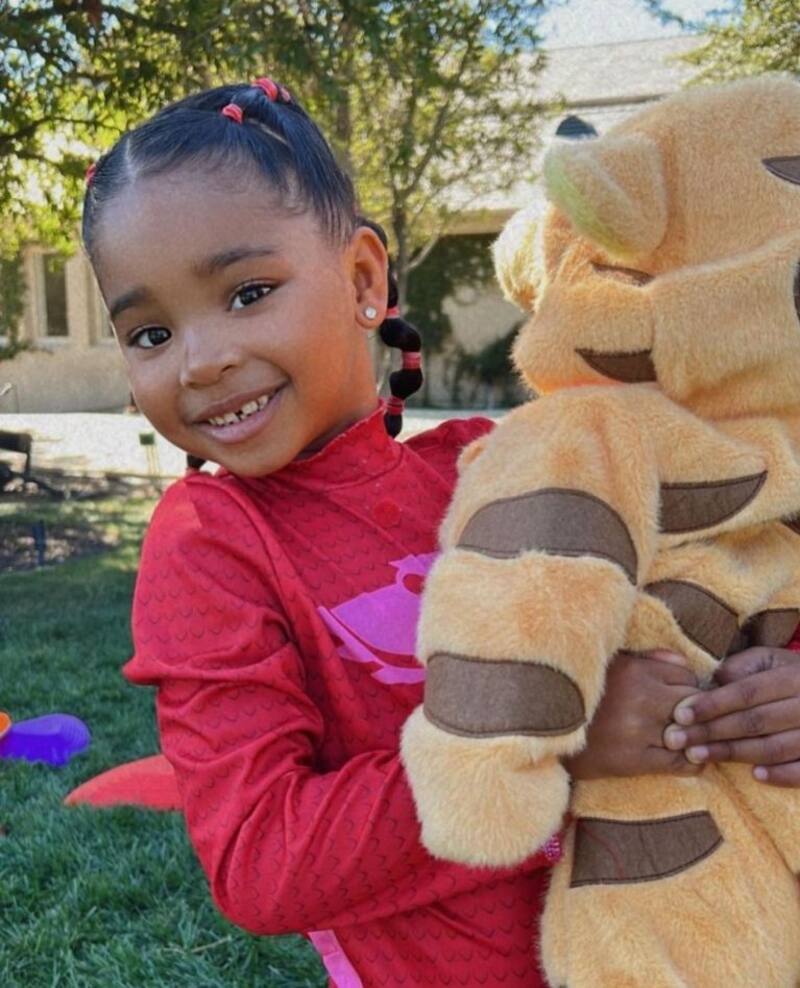 En la primera foto aparece True con un disfraz de Owlette, el personaje que sale en la serie animada PJ Marks. El atuendo es rojo, de manga larga, con una capa y un símbolo rosa al centro. Mientras la también hija de Tristan Thompson sonríe para la cámara no pierde de vista a su pequeño hermano a quien está cargando, y aunque no muestran su cara sí se puede ver que lleva puesto un mameluco de Tigger.