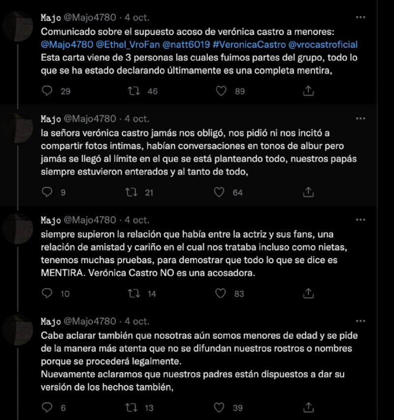 Las adolescentes señalaron que la relación con “La Vero” fue de amistad y que nunca las acosó: “La relación que había entre la actriz y sus fans, una relación de amistad y cariño en el cual nos trataba incluso como nietas, tenemos muchas pruebas, para demostrar que todo lo que se dice es Mentira. Verónica Castro No es una acosadora”.