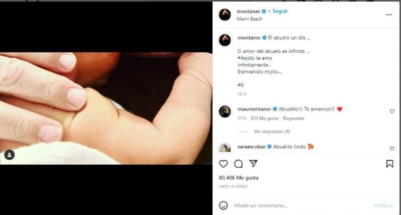 Mau utilizó su cuenta de Instagram primero para dar el anuncio de que Apolo nació el 5 de octubre como un niño sano, y de inmediato comenzó a recibir los buenos deseos de su familia, colegas, amigos, luego subió a sus stories unas foto más que han cautivado a sus fans, pues se puede ver a Ricardo Montaner (65) cargando al bebé.