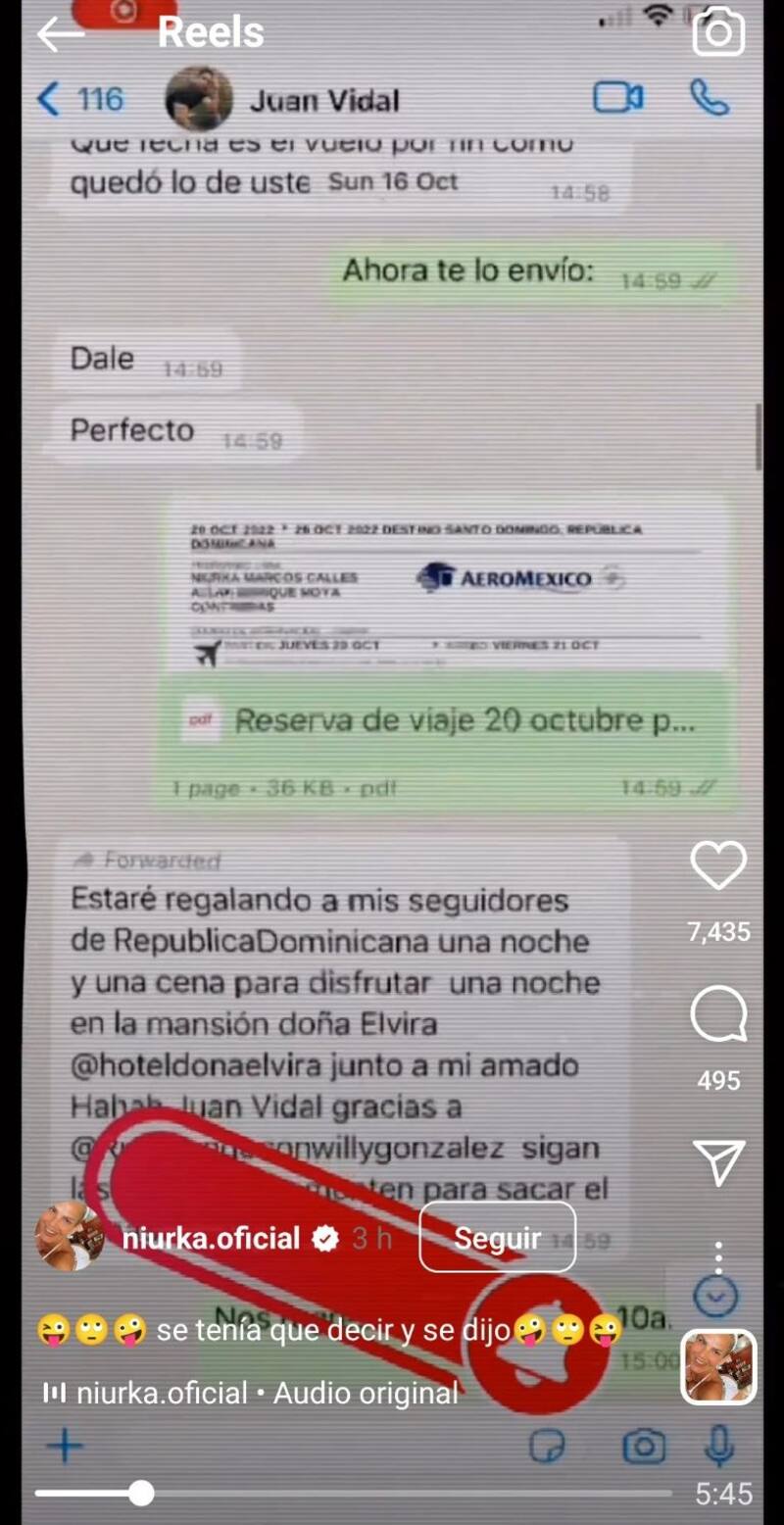 La bailarina publicó un video en su cuenta de Instagram en el que mostró una captura de pantalla del boleto que compró para viajar a República Dominicana. “Estás encaprichado en hacerle creer a la gente que yo me enojé porque te fuiste a Santo Domingo, y no es cierto porque tú mantuviste la distancia en la relación todo el tiempo. Yo tenía mis boletos comprados, te los enseñó mi manager”, dijo.