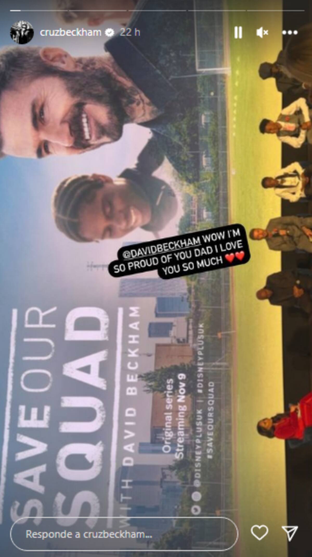 Del mismo modo, Cruz también dedicó unas palabras a David en sus redes sociales: “¡Wow! Estoy tan orgulloso de ti papá. Te amo mucho”, se lee en sus historias de Instagram con una imagen de la rueda de prensa que ofreció el ex futbolista para presentar el proyecto, que estará disponible en Disney+ a partir del próximo 9 de noviembre.