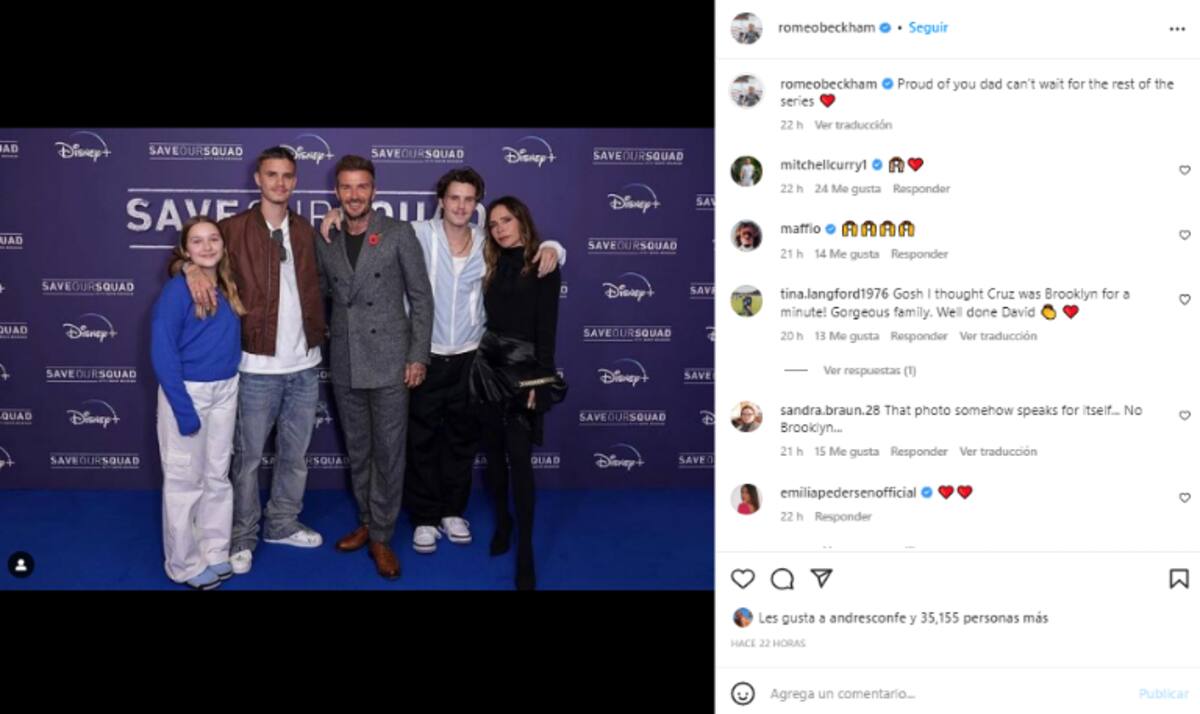 “No podría estar más orgulloso esta noche de David Beckham y su increíble equipo. Estaba totalmente impresionada y emocionada esta noche viendo la proyección de #SaveOurSquad”, escribió la ex Spice Girls en una publicación de su Instagram con un retrato familiar. Mientras que Romeo posteó la misma imagen de su madre con un mensaje de admiración a su padre: “Orgulloso de ti papá. No puedo esperar al resto de la serie”.