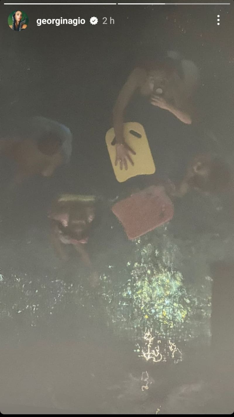 Mediante una historia en Instagram reveló que tanto ella como tres de sus hijos, Alana, Mateo, y Eva, están disfrutando de un día en la alberca. En la foto se puede ver la influencer y los niños están nadando mientras se toman de una tabla para poder mejorar sus brazadas.