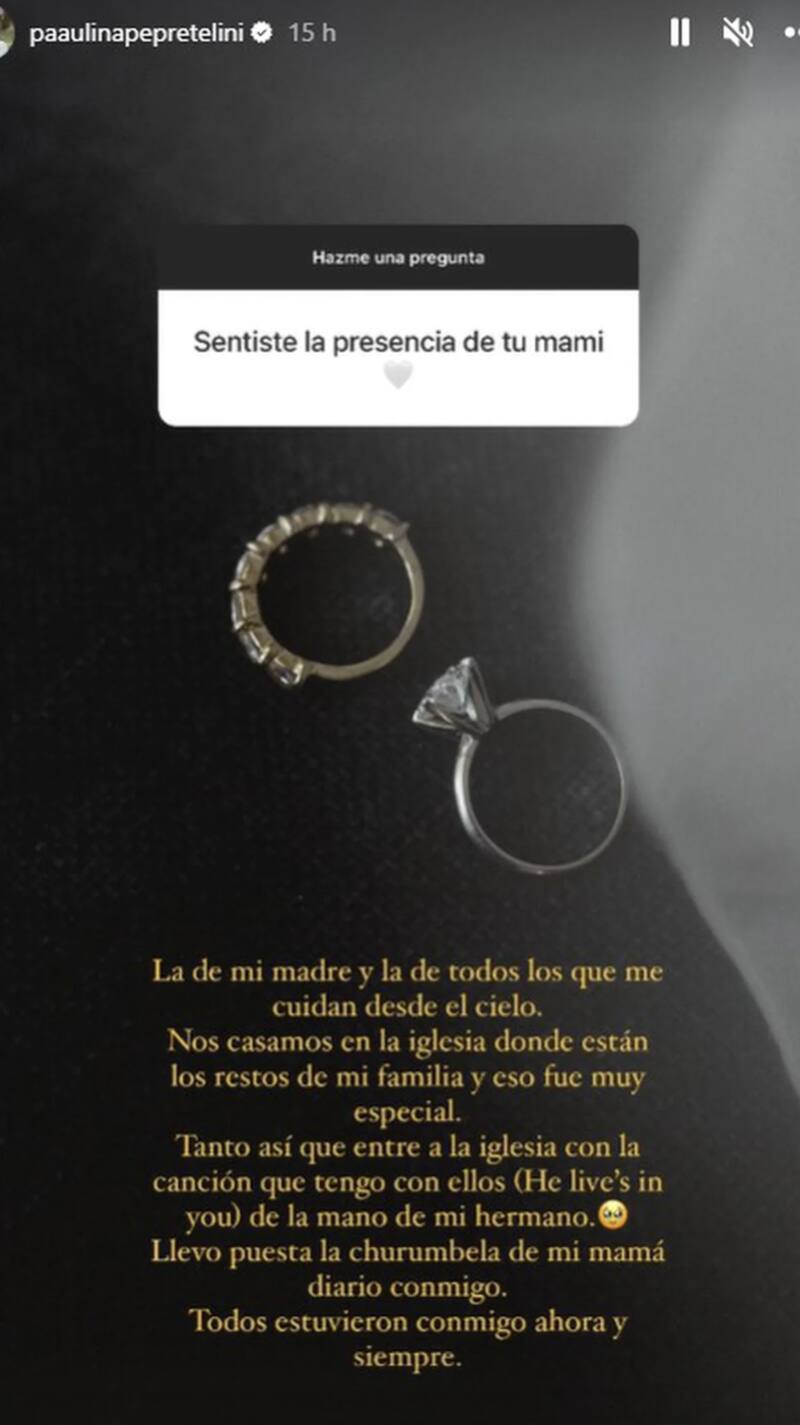 Por último, la esposa de Fernando Tena habló de los detalles que vivió que hicieron que sintiera la presencia de su mamá, quien falleció en 2007. "La de mi madre y la de todos los que me cuidan desde el cielo. Nos casamos en la iglesia donde están los restos de mi familia y eso fue muy especial. Tanto así que entré a la iglesia con la canción que tengo con ellos (He live's in you) de la mano de mi hermano. Llevo puesta la churumbela de mi mamá a diario conmigo. Todos estuvieron conmigo ahora y siempre", detalló Peña.