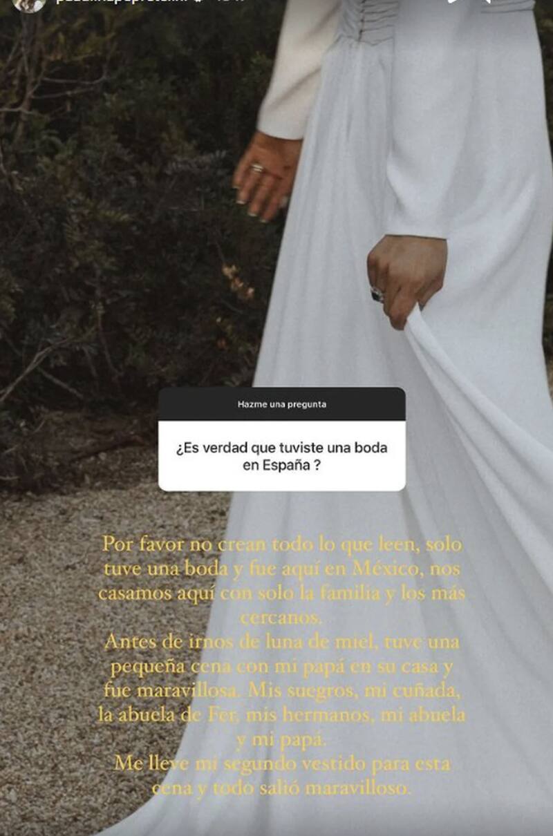 "Por favor no crean todo lo que leen, solo tuve una boda y fue aquí en México. Nos casamos aquí con solo la familia y los más cercanos. Antes de irnos de luna de miel tuve una pequeña cena con mi papá en su casa y fue maravillosa. Mis suegros, mi cuñada, la abuela de Fer, mis hermanos, mi abuela y mi papá. Me llevé mi segundo vestido para esta cena y todo salió maravilloso", indicó Paulina respondiendo a la pregunta de que si tuvo dos bodas.