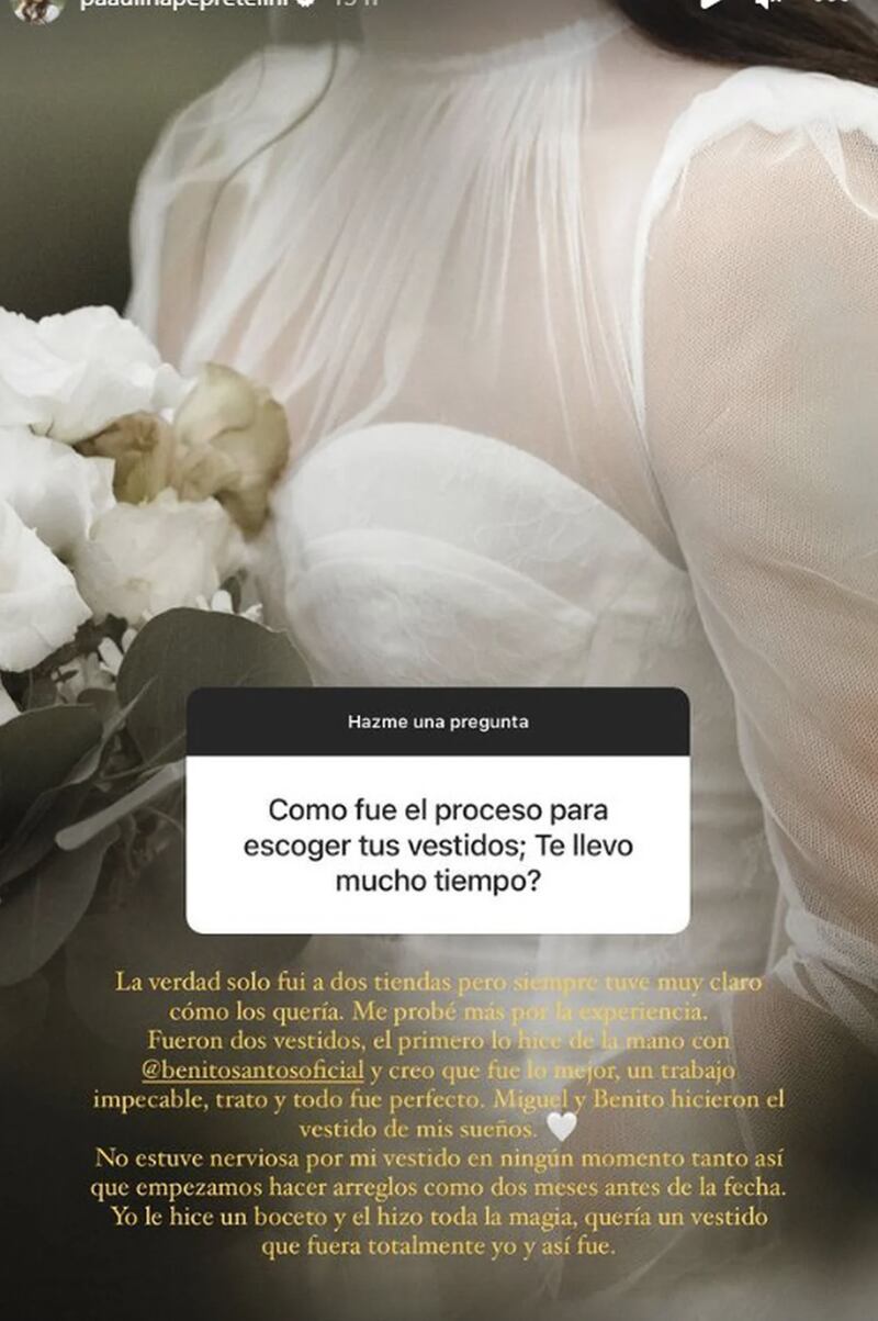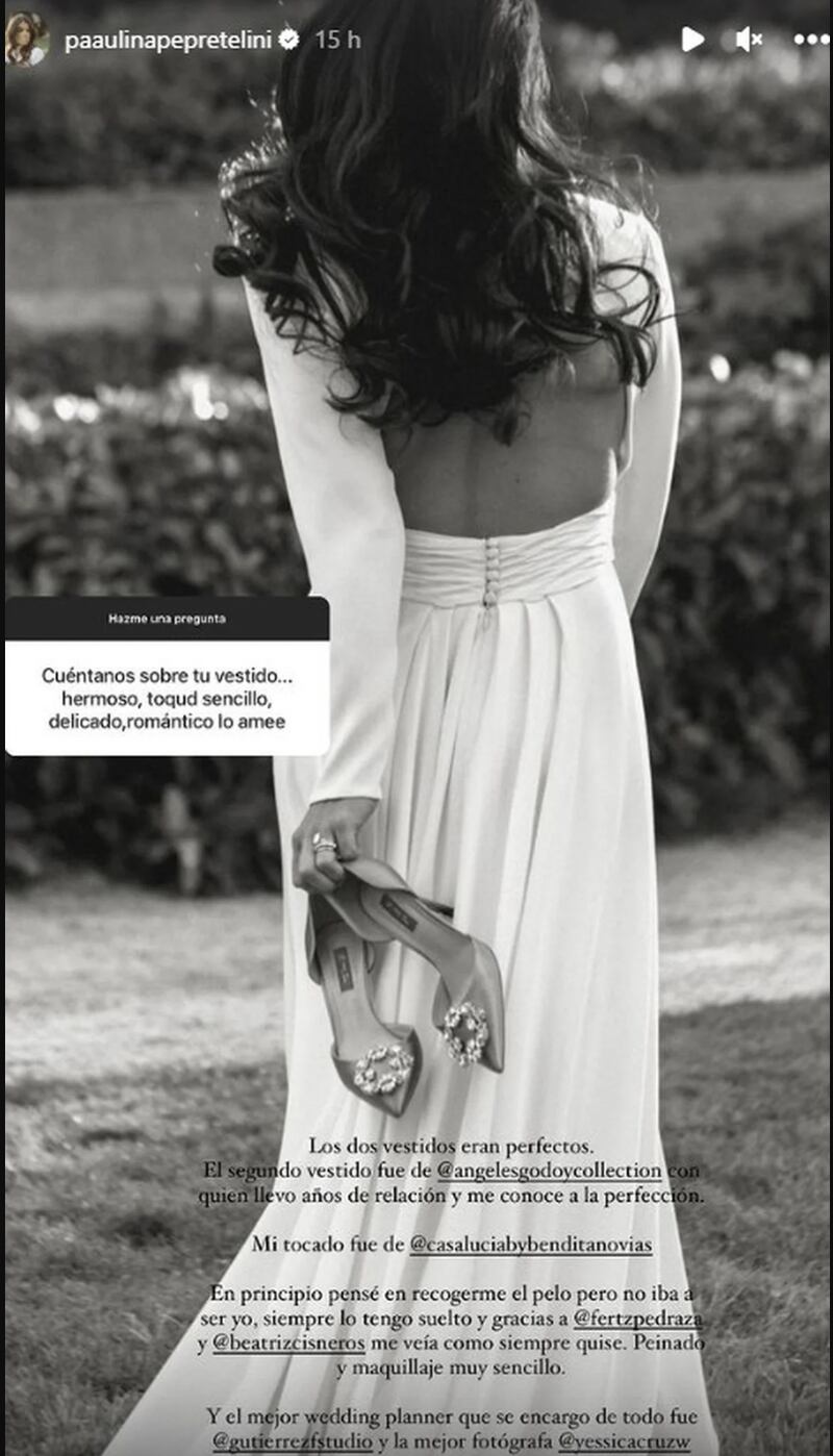 "El segundo vestido fue de Ángeles Godoy con quien llevo años de relación y me conoce a la perfección. Mi tocado fue de Casa Lucía y Bendita Novias. En principio pensé en recogerme el pelo pero no iba a ser yo, siempre lo tengo suelto y gracias a Fertz Pedraza y Beatriz Cisneros me veía como siempre quise. Peinado y maquillaje muy sencillo. Y el mejor wedding planner que se encargó de todo fue Gutiérrez Studio y la mejor fotografía de Yessica Cruz", agregó Paulina.