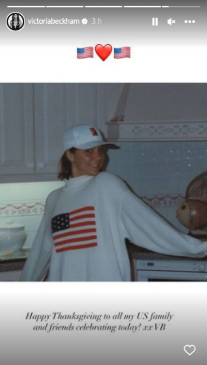 Por otra parte, la diseñadora de moda y ex Spice Girls también se tomó su tiempo para felicitar y enviar sus buenas vibras en este día tan especial a algunos de sus seres queridos. “¡Feliz día de Acción de Gracias a toda mi familia y amigos de Estados Unidos que celebran hoy!”, escribió Victoria en sus historias de Instagram.