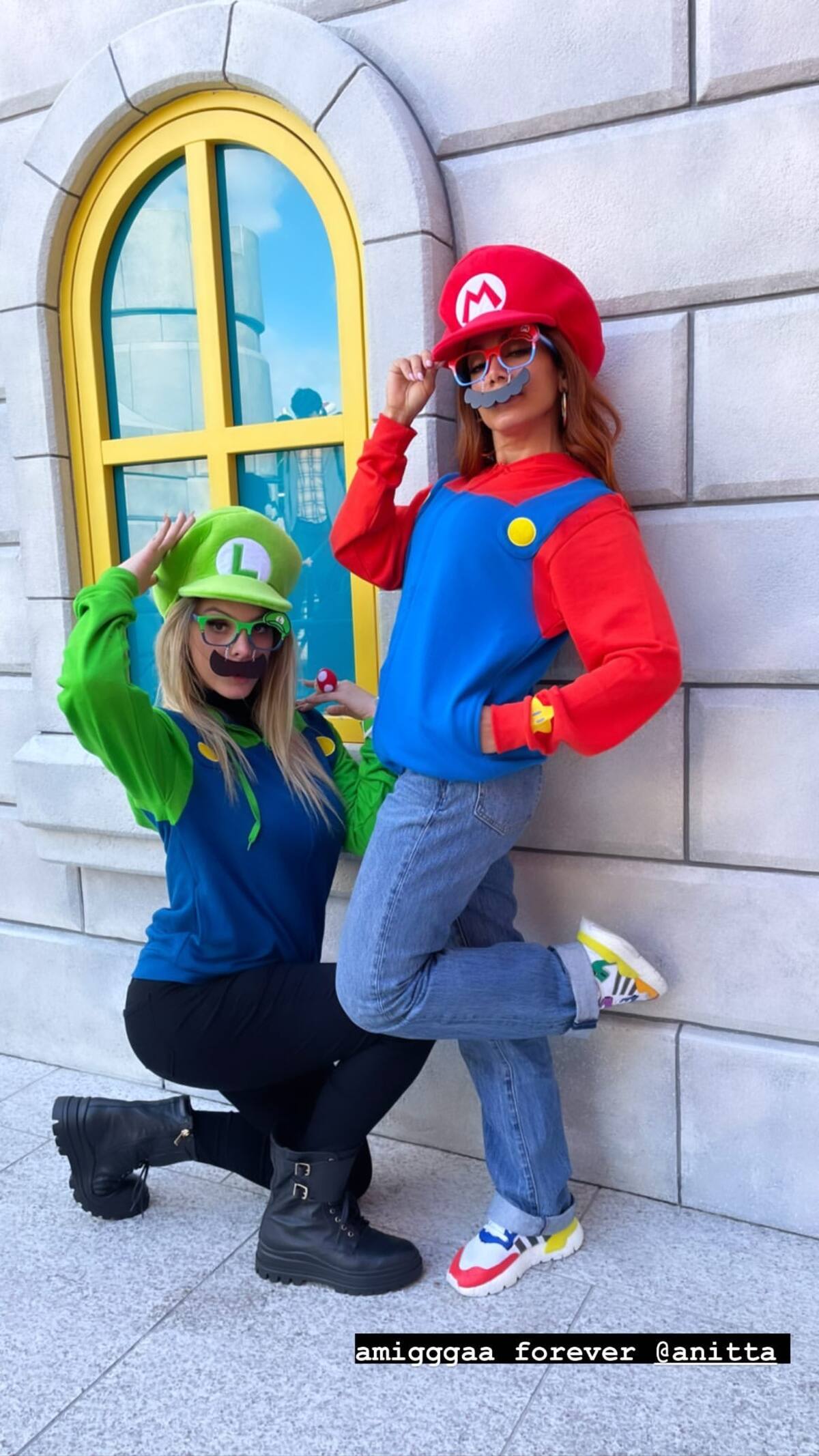 Vestidas con sombrero, anteojos y una sudadera inspirada en los trajes de los populares personajes, ambas dejaron numerosos registros en sus cuentas de Instagram. Lele Pons, vestida como el fontanero verde, compartió en sus historias una imagen en la que aparecía con Anitta vestida como el fontanero rojo que subtituló, "amiga forever", incluyendo un corazón rojo en el importante testimonio sobre la amistad que las une.