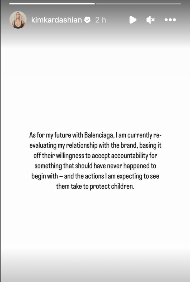 Sin embargo, sobre su relación con la marca afirmó que aún no sabe cuál será el futuro que tomará: "En cuanto a mi futuro con Balenciaga, actualmente estoy reevaluando mi relación con la marca, basándome en su voluntad de aceptar la responsabilidad por algo que, para empezar, nunca debería haber sucedido, y las acciones que espero verlos tomar", dijo Kardashian.