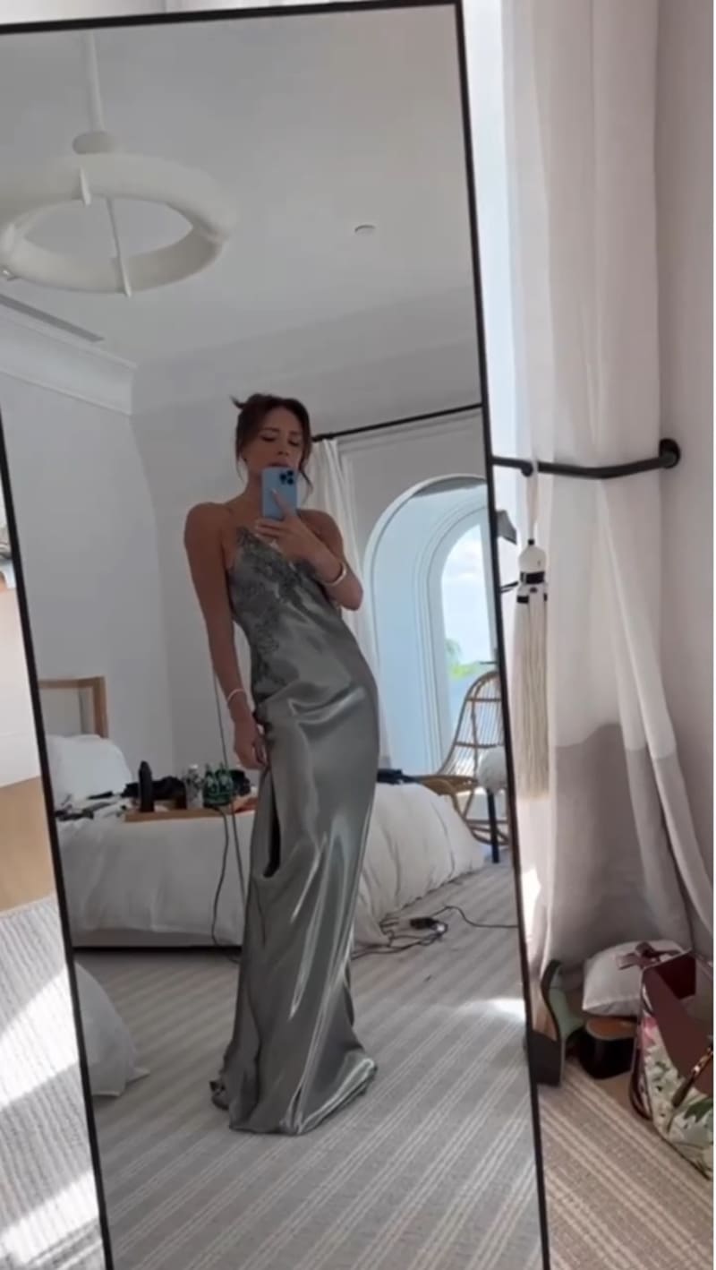 A través de su red social, la esposa de David Beckham modeló (ver video abajo) y ofreció un exclusivo vestido de noche inspirado en el "glamour de Hollywood de los 40, pero con la audacia de la escena club de los 70". La ex Spice Girls se grabó frente a un espejo ofertando un número limitado de los vestidos metálicos que están disponibles en colores plata y oro brillante. El modelo fue el que confeccionó y usó para la boda de su hijo Brooklyn con Nicola Peltz.