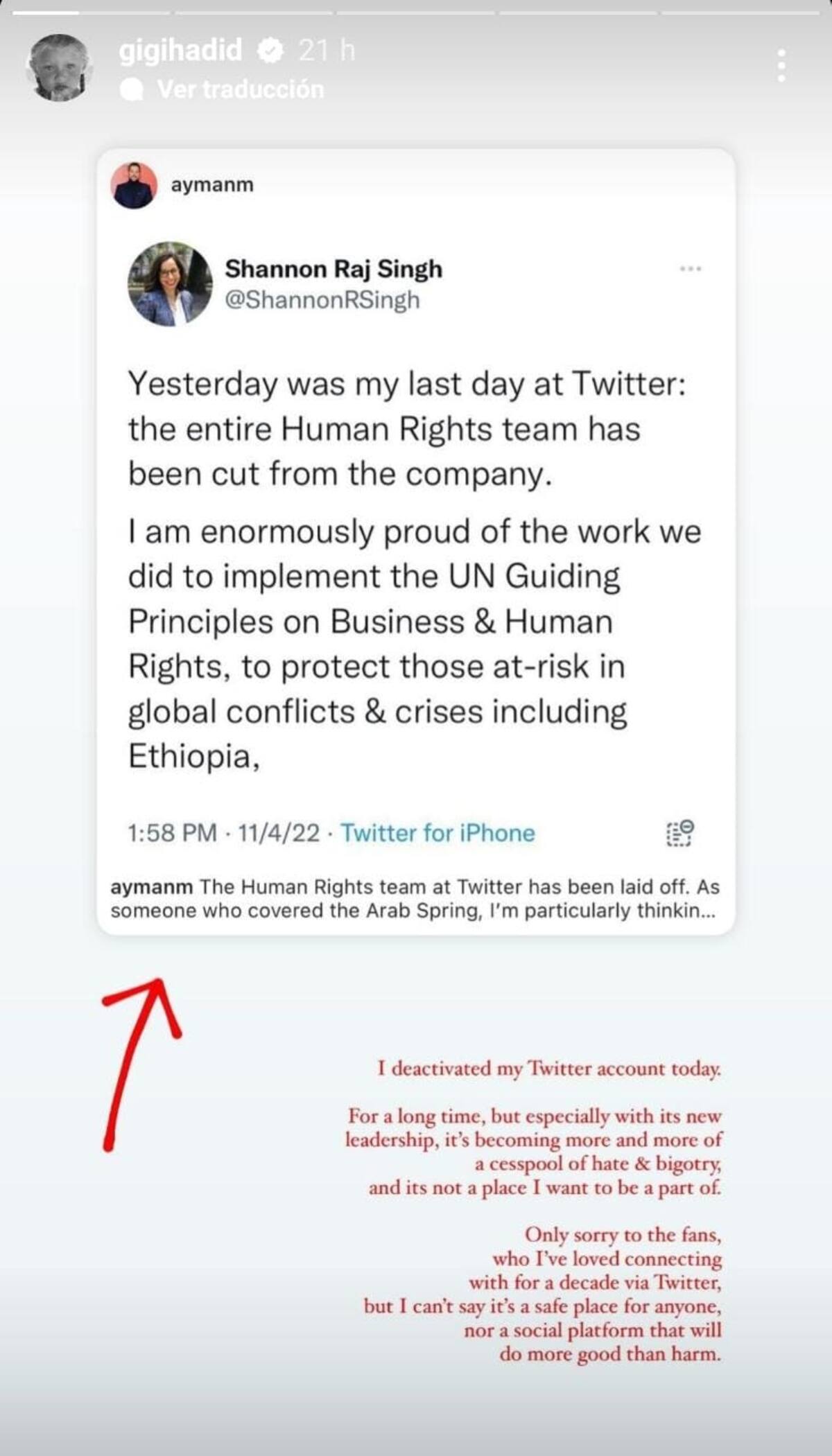 La supermodelo Gigi Hadid argumentó que dejó la app porque cree que no es un lugar seguro. "Solo lo siento por los fanáticos, con quienes me ha encantado conectarme durante una década a través de Twitter, pero no puedo decir que sea un lugar seguro para nadie, ni una plataforma social que haga más bien que mal", agregó.