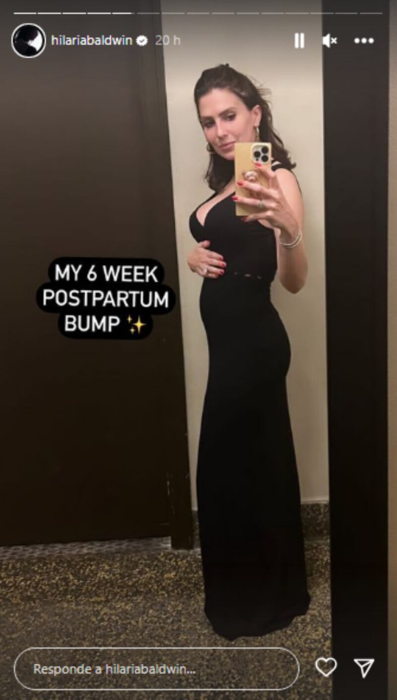 A través de sus historias de Instagram, la también escritora no tuvo ningún problema en enseñar tal cual su barriga postparto tras 6 semanas de haber dado a luz. La imagen fue tomada en selfie frente a un espejo y se ve a Hilaria con un vestido negro ajustado.