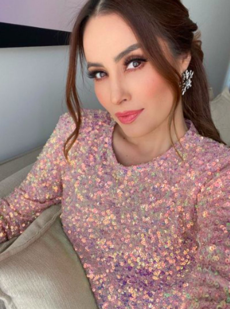 La presentadora de televisión Cynthia Rodríguez (38) compartió con sus seguidores el look que probablemente lucirá en Navidad. Un falda por arriba de la rodilla con un ligero ceñido de lado que acompañará con una blusa de manga larga de cuello redondo; el toque del atuendo se lo dan las infinitas lentejuelas rosas, blancas y amarillas, ¡todas ellas tornaso!