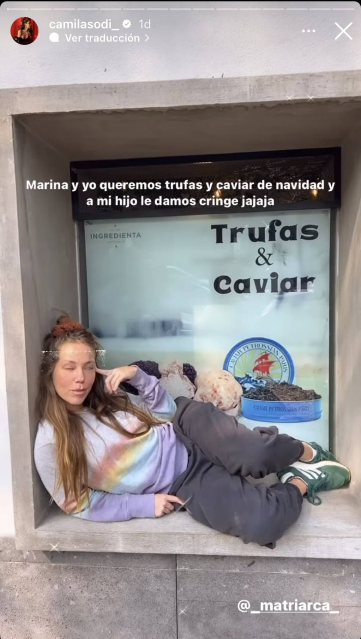 En el video se encuentra Marina Sodi, hermana de Camila, recostada sobre una ventana en la calle y de fondo hay un anuncio de “Trufas & Caviar”, entonces asegura que ya sabe lo que quiere para Navidad. Mientras la actriz de Falsa identidad se ríe Jerónimo se queja de su mamá y su tía.