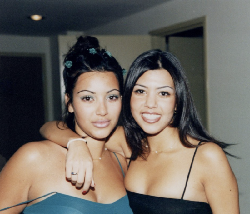 Kim usa una blusa color azul de tirantes y una coleta con algunos adornos del mismo tono en el cabello, mientras que Kourtney viste una prenda muy similar pero negra y su melena suelta. Ambas llevan las cejas muy delgadas y los labios en tono café, un maquillaje que estaba en tendencia en los años 90.