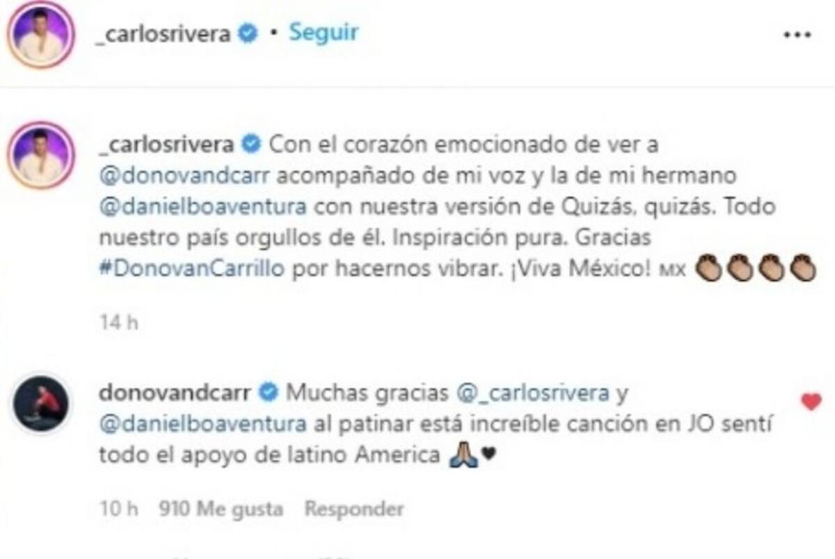 “Con el corazón emocionado de ver a @donovandcarr acompañado de mi voz y la de mi hermano @danielboaventura con nuestra versión de Quizás, quizás”, escribió Carlos en su cuenta de Instagram. "Todo nuestro país orgulloso de él. Inspiración pura. Gracias #DonovanCarrillo por hacernos vibrar. ¡Viva México!”, agregó el también actor quien recibió una emotiva respuesta de parte de Carrillo.
