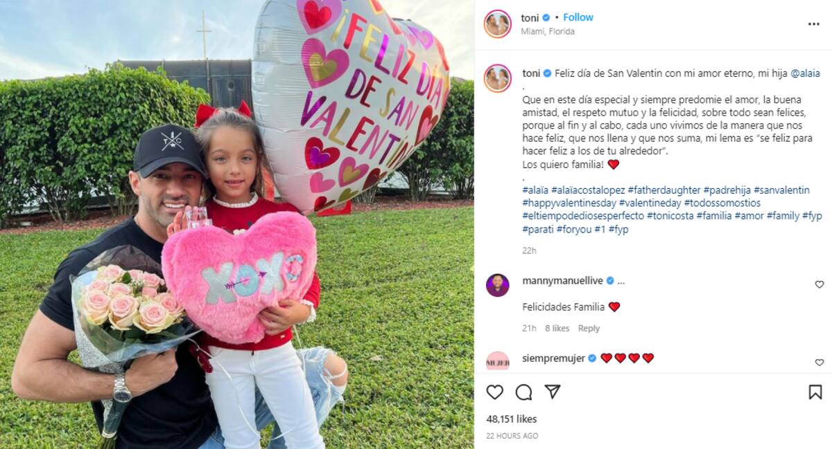 "Feliz día de San Valentin con mi amor eterno, mi hija @alaia. Que en este día especial y siempre predomine el amor, la buena amistad, el respeto mutuo y la felicidad, sobre todo sean felices, porque al fin y al cabo, cada uno vivimos de la manera que nos hace feliz, que nos llena y que nos suma, mi lema es "sé feliz para hacer feliz a los de tu alrededor" Los quiero familia!", escribió en su publicación.