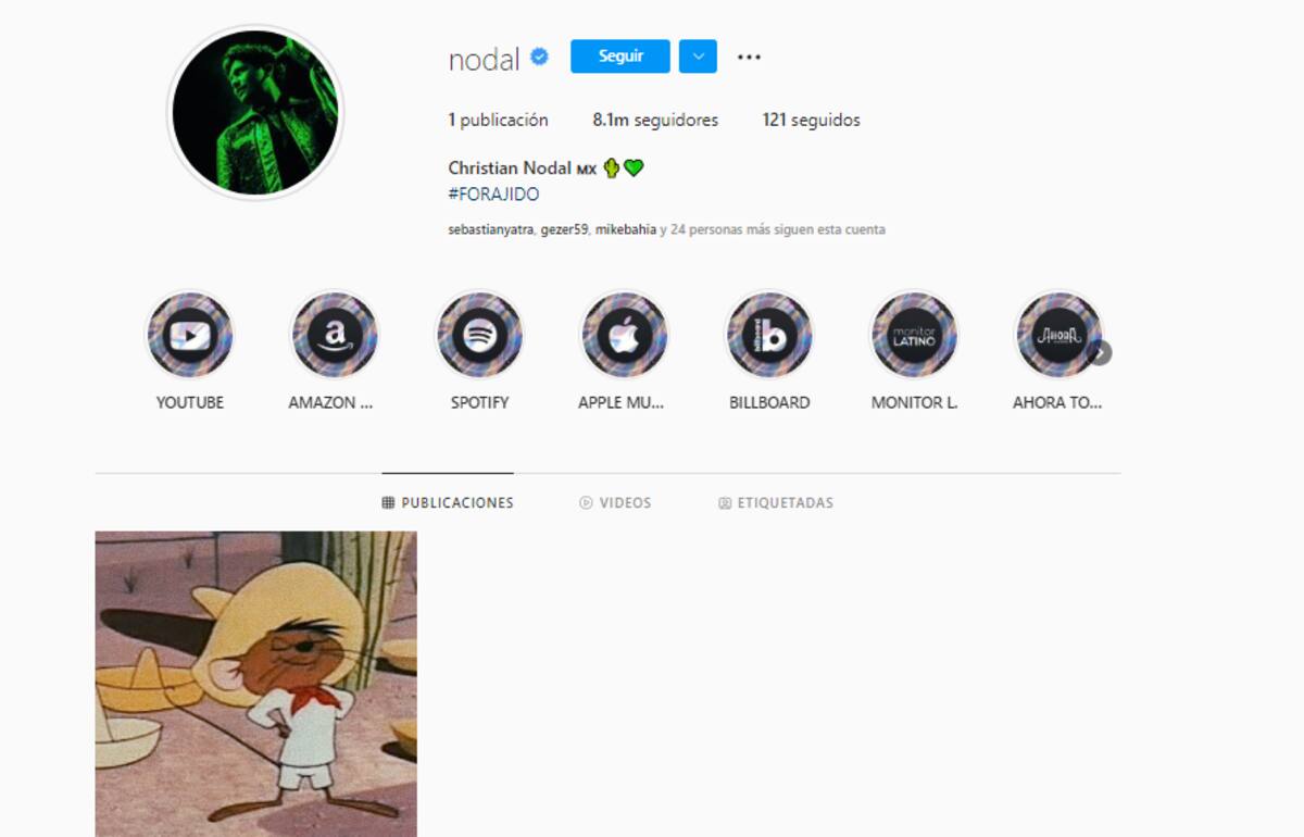 Hace algunas horas, el interprete de Adiós amor, se dispuso a eliminar de su cuenta de Instagram todas sus publicaciones, a excepción de una donde aparece el personaje animado Speedy Gonzales, quien además es uno de sus personalidades favoritos, ya que se identifica con él por el rápido ascenso que ha tenido en su vida profesional.