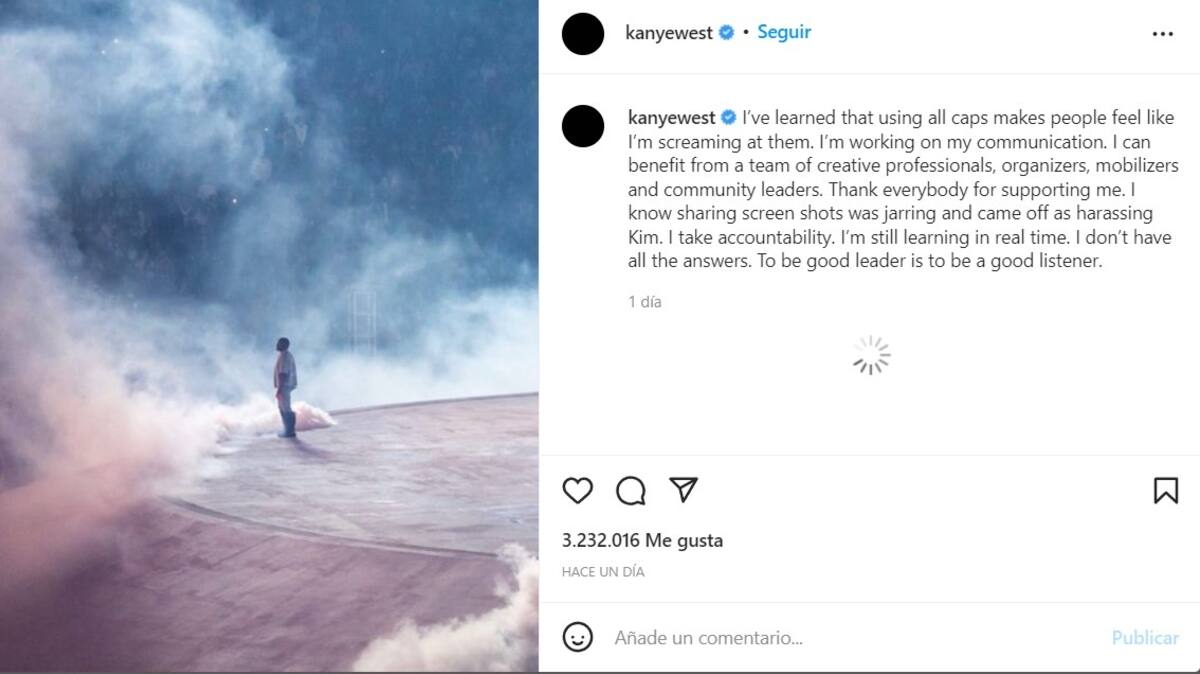 "He aprendido que usar solo mayúsculas hace que la gente piense que les estoy gritando. Estoy trabajando en una mejor comunicación. Puedo beneficiarme de un equipo de profesionales, organizadores, creativos y líderes de la comunidad", escribió el artista, quien recientemente, se dijo, terminó su noviazgo de meses con Julia Fox.