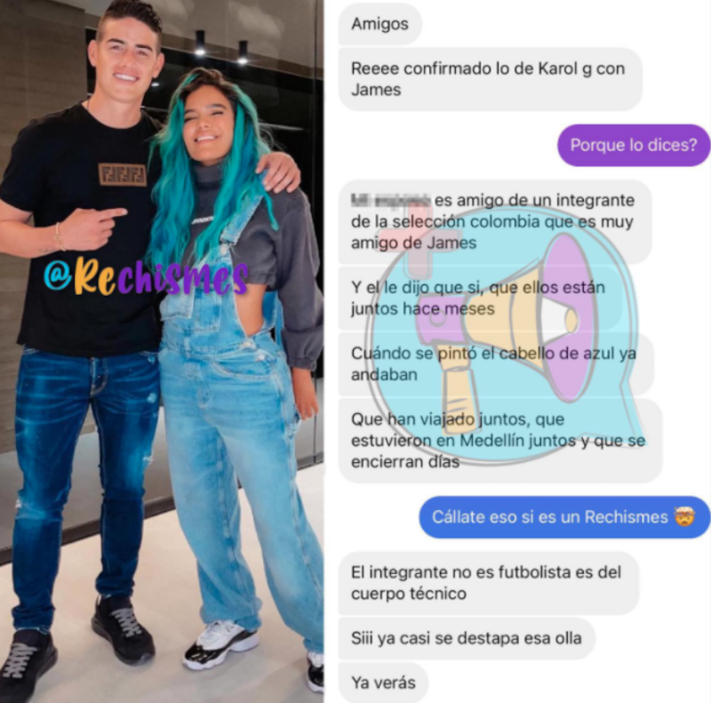 “Amigos, re confirmado que Karol G con James. Mi esposo es amigo de un integrante de la selección Colombia que es muy amigo de James y él le dijo que sí, que ellos estaban juntos hace meses. Cuando él se pintó el cabello de azul, ya andaban. Que han viajado juntos, que estuvieron en Medellín y se encierran días”, es lo que dice el chat filtrado.