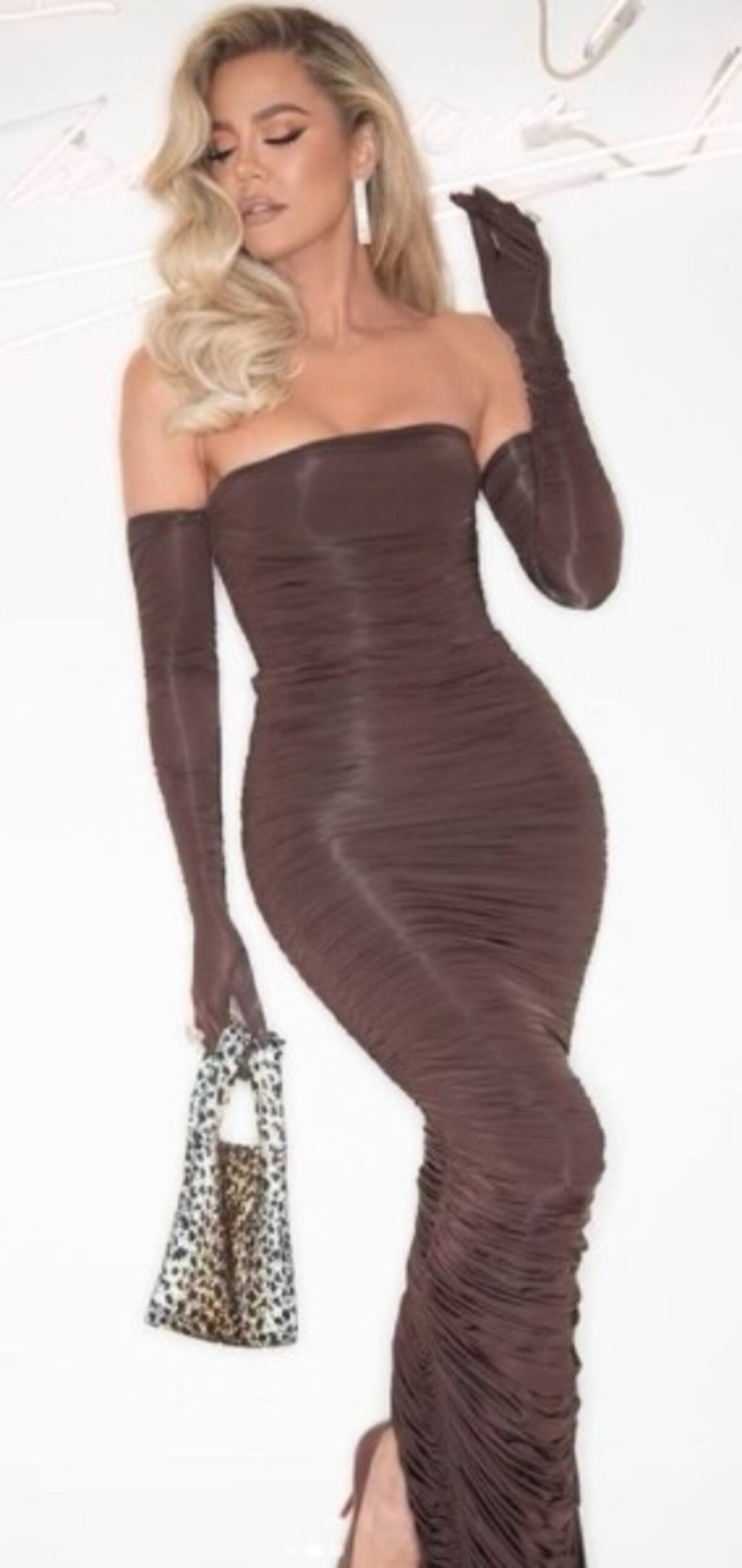 El elegante vestido texturizado se contorneaba con la figura de Khloé, quien también utilizó unos guantes en el tono que le cubrían más allá de los codos.
