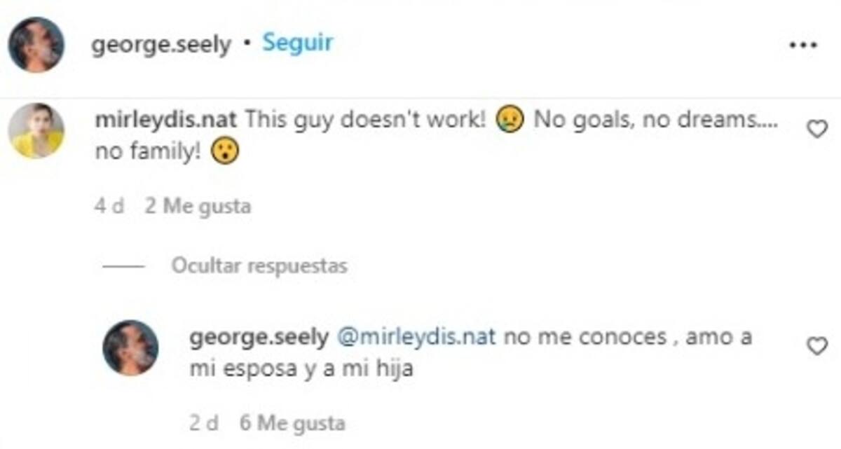 "Este señor no trabaja. No tiene metas, no tiene sueños, no tiene familia", escribió una cibernauta en una publicación que hizo George en Instagram jugando golf. "No me conoces , amo a mi esposa y a mi hija" contestó el libanés. Después de esto recibió más críticas que apoyo.