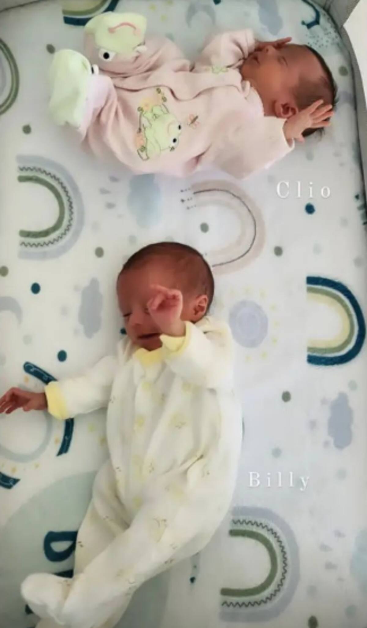 En la imagen se ve a los bebés acostados en su cuna, Clío con un pijama de color rosa y Billy, con una amarilla. Claudia escribió sus nombres al lado de cada uno, con el objetivo de que sus seguidores puedan identificarlos, debido a que son muy pequeños y a simple vista parecen idénticos.