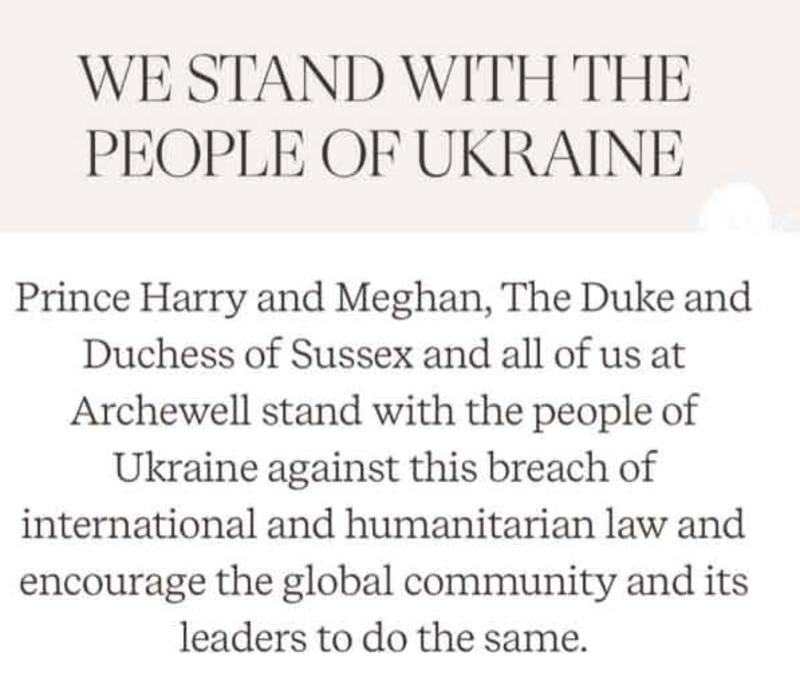 La declaración decía: "El príncipe Harry y Meghan, el duque y la duquesa de Sussex y todos nosotros en Archewell apoyamos al pueblo de Ucrania contra esta violación del derecho internacional y humanitario y alentamos a la comunidad mundial y sus líderes a hacer lo mismo".